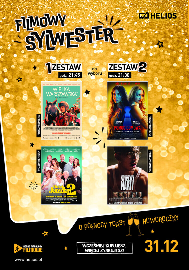 Bawić nas będą m.in. Sydney Sweeney i Amanda Seyffied, a potem jeszcze Timothee Chalamet z Gwyneth Paltrow! W intrygującym zestawie drugim, gwarantujemy zabawę w towarzystwie zniewalająco pięknych kobiet i nie mniej przystojnych mężczyzn. Na początek Sydney Sweeney i Amanda Seyffied w ekranizacji bestsellerowej powieści „POMOC DOMOWA”. Po przerwie na noworoczny toast, ich rolę przejmą Timothee Chalamet z Gwyneth Paltrow w przedpremierowym filmie „WIELKI MARTY”. Będzie energetycznie, zmysłowo, chwilami nieco niebezpiecznie, ale przede wszystkim, bardzo intrygująco... Wszystko to w niepowtarzalnej kinowej atmosferze.