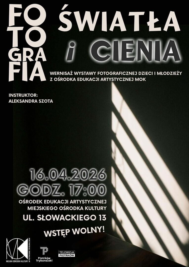 Tu liczy się nie tylko sam obiekt ale przede wszystkim to, jak pada na niego światło. I właśnie taką zabawę światłem i cieniem zaproponowała swoim uczniom Aleksandra Szota, instruktor warsztatów fotograficznych z Ośrodka Edukacji Artystycznej MOK. Jak młodzi fotograficy poradzili sobie z tm zadaniem, przekonać będzie można się podczas wernisażu wystawy. Serdecznie zapraszamy- 16 kwietnia 2026 r. godz. 17:00 , Ośrodek Edukacji Artystycznej MOK ul. Słowackiego 13, - „Fotografia światła i cienia”