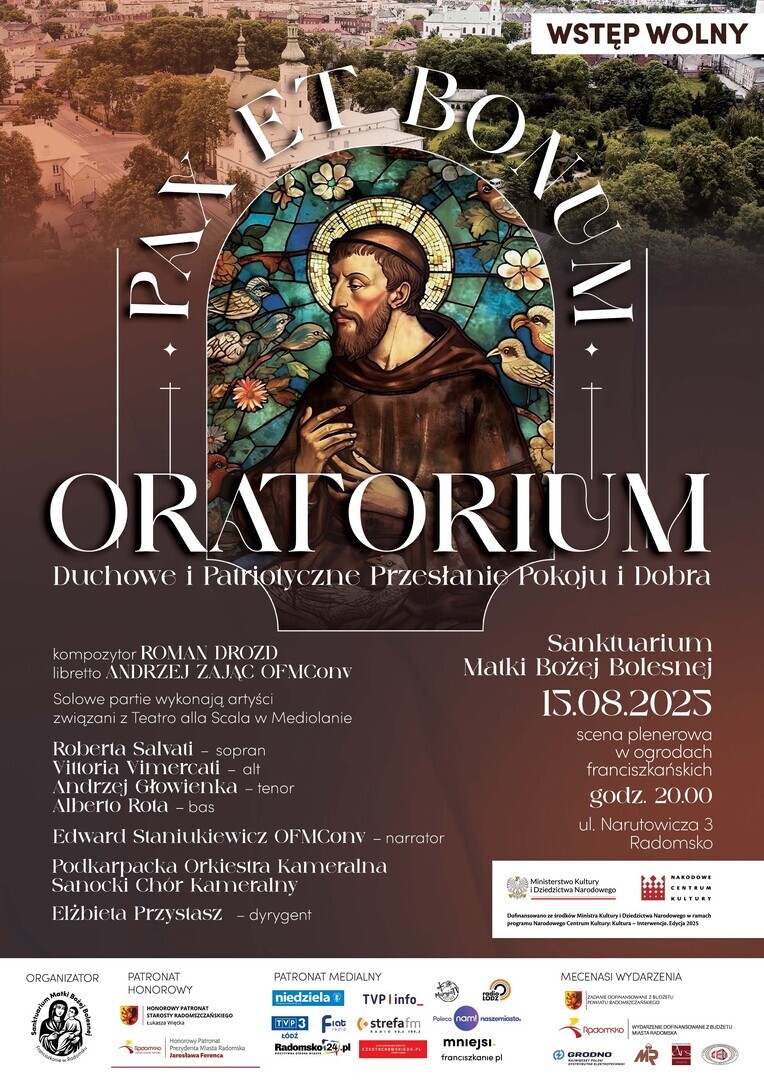 Franciszkanie z Radomska zapraszają w piątek, 15 sierpnia 2025 r. o godz. 20:00 do ogrodu klasztornego przy ul. Narutowicza 3, na wyjątkowe wydarzenie o charakterze religijno-patriotycznym jakim będzie Oratorium Pax et Bonum.