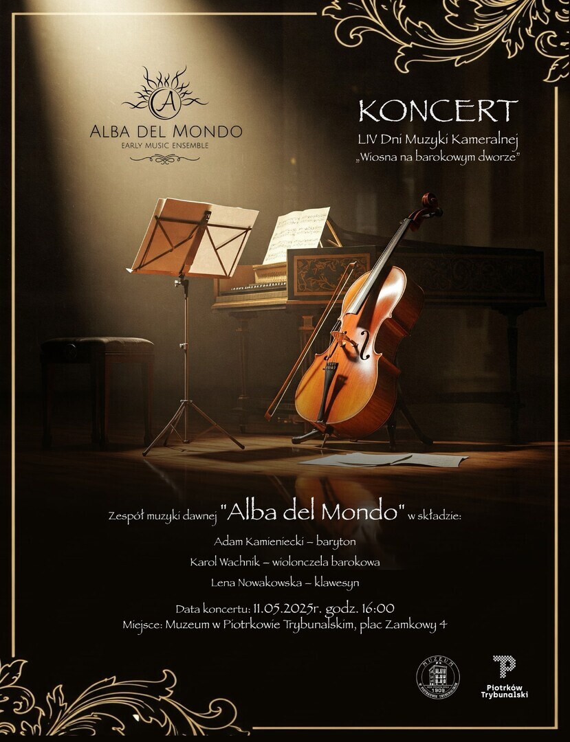 Tym razem wystąpi dla Państwa zespół muzyki dawnej "Alba del Mondo" w składzie: Adam Kamieniecki – baryton, Karol Wachnik – wiolonczela barokowa oraz Lena Nowakowska – klawesyn w programie „Wiosna na barokowym dworze”.