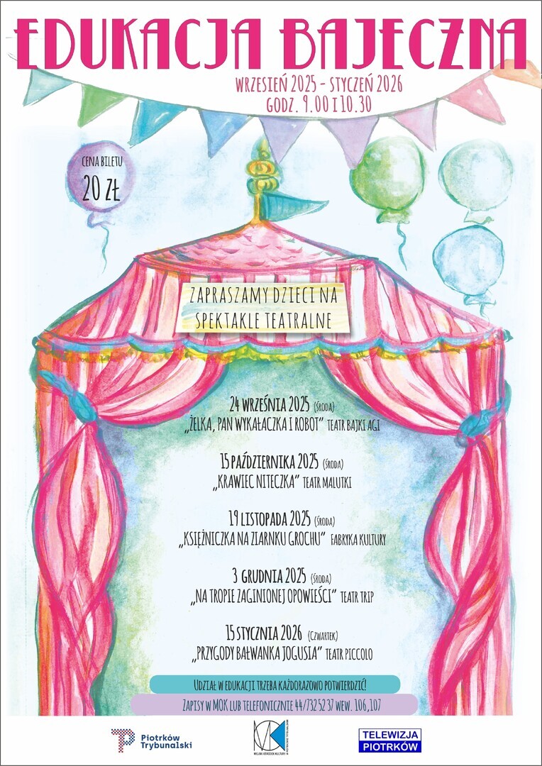 Zapraszamy grupy zorganizowane z przedszkoli i szkół podstawowych na kolejną edycję cyklu spektakli Edukacja Bajeczna! W pierwszej połowie sezonu artystycznego wrzesień 2025 - styczeń 2026 czekają na Was niezapomniane przedstawienia, pełne magii, śmiechu i wzruszeń. To doskonała okazja, aby wprowadzić najmłodszych w fascynujący świat teatru.