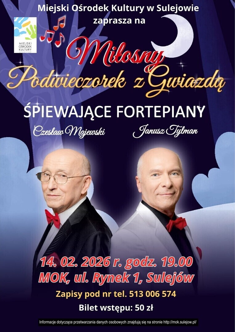 Miejski Ośrodek Kultury w Sulejowie serdecznie zaprasza na wyjątkowy, pełen romantyzmu i muzycznych wzruszeń wieczór ŚPIEWAJĄCE FORTEPIANYŚPIEWAJĄCE FORTEPIANY Wystąpią dla Państwa: Czesław Majewski i Janusz Tylman
