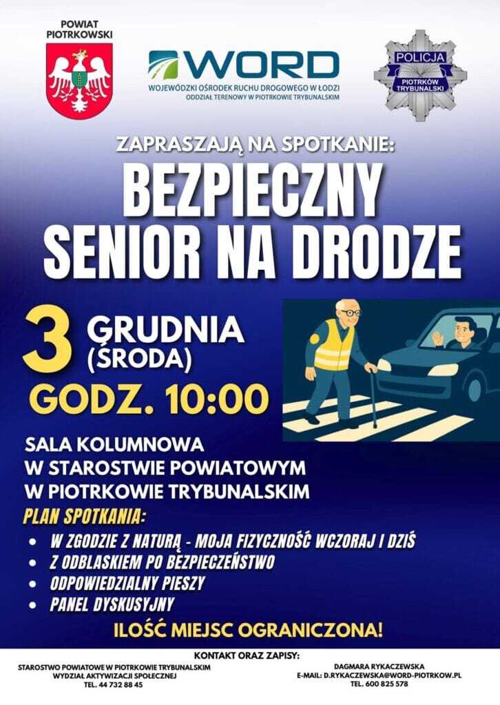 Codziennie wszyscy korzystamy z dróg – jako piesi, kierowcy, pasażerowie. Ale to właśnie seniorzy są jedną z grup najbardziej narażonych na niebezpieczne sytuacje w ruchu drogowym. Dlatego 3 grudnia o godzinie 10:00 w Sali Kolumnowej Starostwa Powiatowego w Piotrkowie Trybunalskim odbędzie się wydarzenie „Bezpieczny Senior na Drodze” – spotkanie, które ma pomóc starszym mieszkańcom poruszać się pewniej, świadomiej i przede wszystkim bezpieczniej.