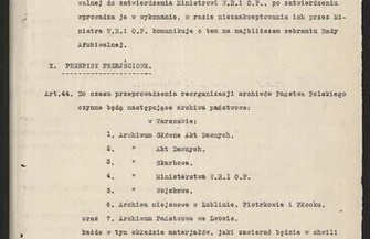 Dekret zamykał dziesiąty rozdział, w którym zawarte były przepisy przejściowe. Jest on najbardziej interesujący z punktu widzenia ówczesnej sieci archiwów państwowych. W momencie uchwalania Dekretu, Wydziałowi Archiwów Państwowych formalnie podporządkowano następujące, zlokalizowane w Warszawie archiwa państwowe: AGAD, AAD, Archiwum Skarbowe, Archiwum MWRiOP, Archiwum Wojskowe oraz archiwa w Lublinie, Piotrkowie, Płocku i we Lwowie. Na mocy art. 44, ministrowi WRiOP przysługiwało również prawo wydawania zarządzeń, które obejmowały swym zasięgiem archiwa we Lwowie i Krakowie, a które w praktyce nie były jeszcze w zasięgu jego działania. Ostatni artykuł (46) regulował kwestie dokumentów oraz materiałów archiwalnych wytworzonych i pozostawionych przez urzędy rosyjskie i władze okupacyjne. Miały one być docelowo włączone do zasobów archiwów państwowych już działających lub wejść w skład zasobów archiwów nowo tworzonych. Przewidziano również taką ewentualność, kiedy to dokumenty te mogły być przekazane odpowiednim władzom i urzędom państwowym do ich użytku bieżącego.