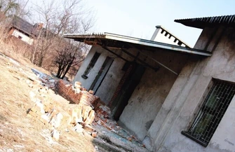 3. Wcale nie lepiej przedstawia się stojący kilka metrów dalej budynek dawnej piaskowni lokomotyw i szkolenia grup drużniczych. Zawaleniem w każdej chwili grozi zadaszenie nad wejściem do budynku, bo złodzieje złomu powycinali podpory podtrzymujące konstrukcję...