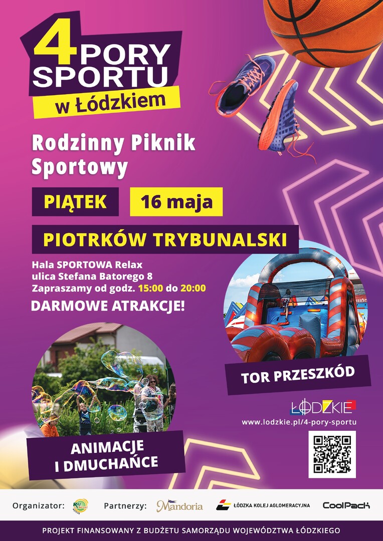 • Piknik rodzinny "4 Pory Sportu w Łódzkiem" odbędzie się w hali sportowej Relax w Piotrkowie Trybunalskim o godzinie 15:00 w piątek, 16 maja.