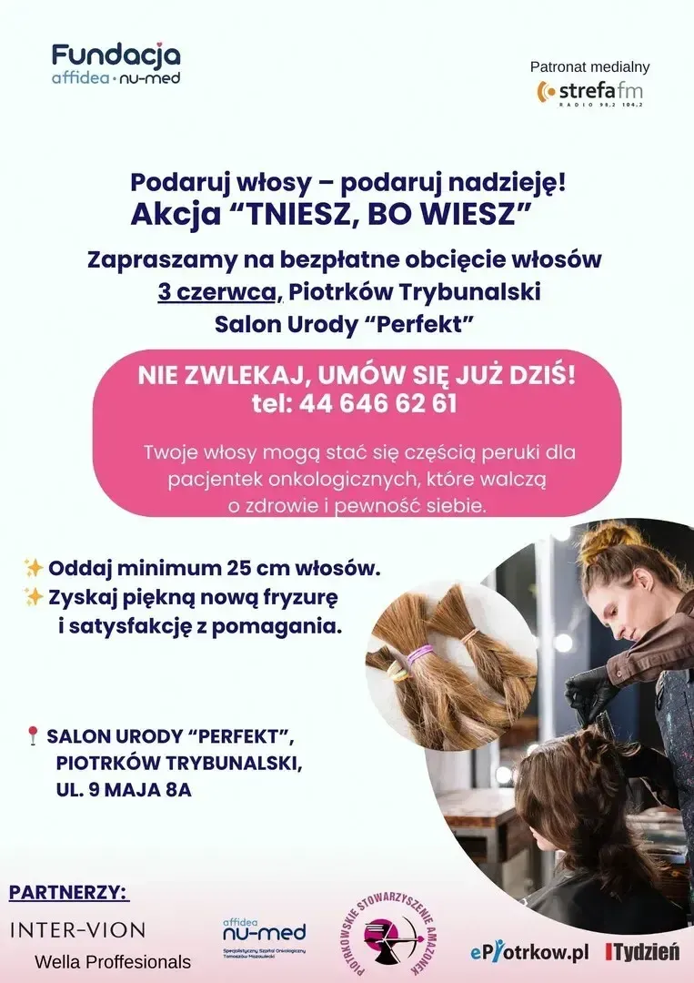 We wtorek, 3 czerwca 2025 r. w Salonie Urody „Perfekt" przy ul. 9 Maja 8a w Piotrkowie Trybunalskim odbędzie się akcja charytatywna „TNIESZ, BO WIESZ", której celem jest zbiórka włosów na peruki dla pacjentek onkologicznych. Wydarzenie organizuje Fundacja NU-MED we współpracy z lokalnym salonem urody.
