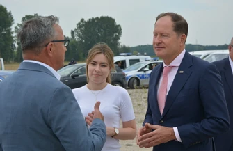 Ambasador Mark Brzezinski w czasie wizyty na farmie wiatrowej wjechał na szczyt 120-metrowej turbiny. W czasie rozmów z uczestnikami dzisiejszego spotkania chwalił wykorzystywanie zielonej energii.