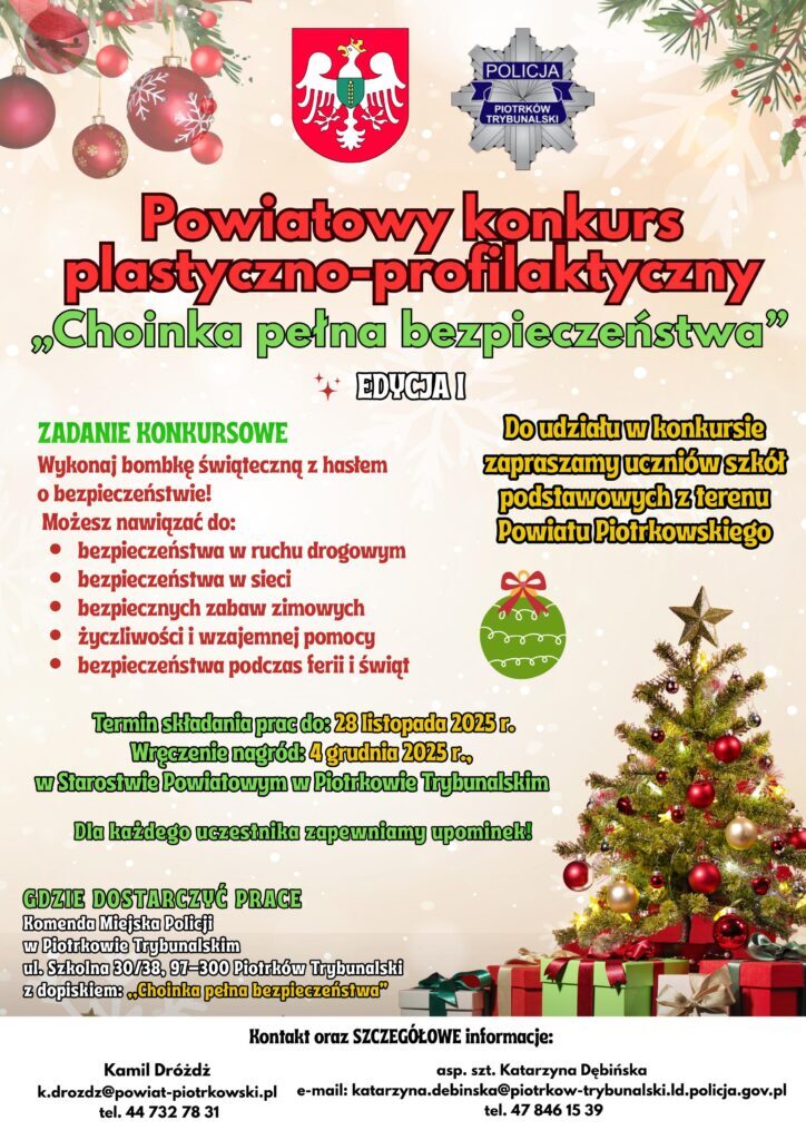 Święta Bożego Narodzenia to czas radości, rodzinnego ciepła i wspólnego spędzania czasu. To także doskonała okazja, by przypomnieć o tym, jak ważne jest bezpieczeństwo – zarówno w domu, jak i poza nim. Właśnie z takiego założenia wyszli organizatorzy nowego, powiatowego konkursu plastyczno-profilaktycznego „Choinka pełna bezpieczeństwa”, do którego zapraszani są uczniowie szkół podstawowych z terenu Powiatu Piotrkowskiego.