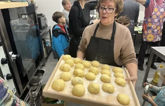 Z pokolenia na pokolenie kuchnia i przygotowywanie smacznych dań to moja pasja i sposób na życie. Przepis na dobrego pączka przekazała mi mama, a ja dzielę się nim z kolejnymi osobami, dziś z pracownikami urzędu na czele z burmistrzem, który jak widać nam tu pomaga. Do wyrobienia ciasta na 33 pączki potrzebujemy: 1 kg mąki, 10 dag drożdży, 0,5 l mleka, 200 gr margaryny, 3/4 szklanki cukru, 10 żółtek i 4 łyżki spirytusu. Ciasto wyrabiamy, odstawiamy, a po pewnym czasie urabiamy pączki zatapiając w cieście marmoladę. Potem smażymy w oleju, smarujemy lukrem i posypujemy skórką z pomarańczy - zdradza swój przepis Maria Owsianka.