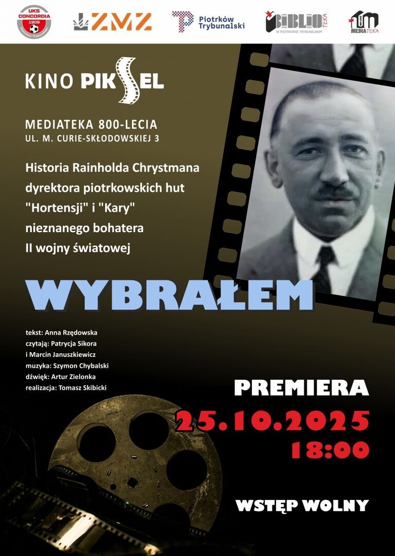 W sobotę, 25 października o godz. 18:00 w Mediatece 800-lecia (ul. M. Curie-Skłodowskiej 3) odbędzie się premiera filmu „Wybrałem”. Produkcja opowiada historię Rainholda Chrystmana, dyrektora piotrkowskich hut Hortensja i Kara, który w czasie II wojny światowej wykazał się odwagą i człowieczeństwem. Wstęp wolny.