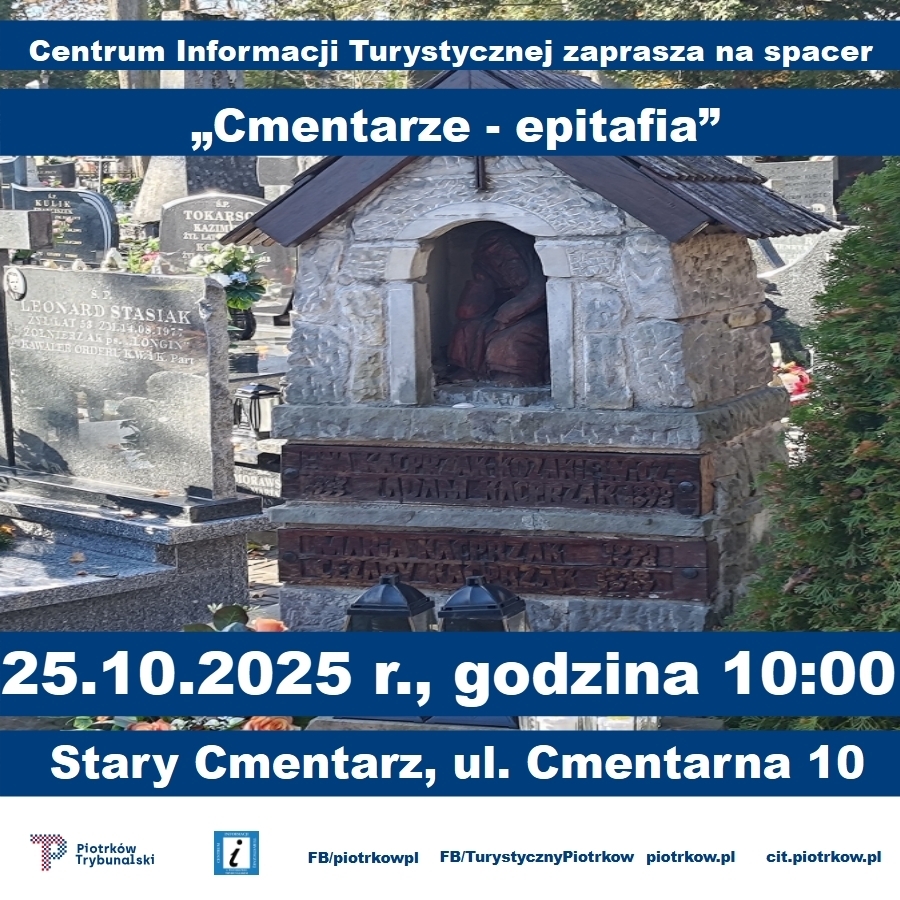 W sobotę, 25 października o godz. 10:00 Centrum Informacji Turystycznej zaprasza na ostatni w tym roku spacer po piotrkowskich cmentarzach. Przewodnik Paweł Kendra opowie o najciekawszych epitafiach i nagrobkach, przybliżając historię miasta. Zbiórka przy bramie głównej Starego Cmentarza, ul. Cmentarna 10.