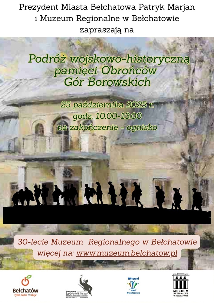 Muzeum Regionalne w Bełchatowie zaprasza w sobotę, 25 października, na wyjątkową podróż wojskowo-historyczną śladami Obrońców Gór Borowskich. Zbiórka o godz. 10:00 przy Pomniku na Górach Borowskich, zakończenie przy wspólnym ognisku. Wydarzenie jest częścią obchodów 30-lecia muzeum. Udział jest bezpłatny, liczba miejsc ograniczona.