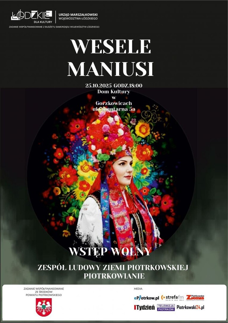 Niezwykłe widowisko pt. "Wesele Maniusi" w wykonaniu Zespołu Ludowego Ziemi Piotrkowskiej Piotrkowianie. Start o godz. 18.00 w Domku Kultury w Gorzkowicach.