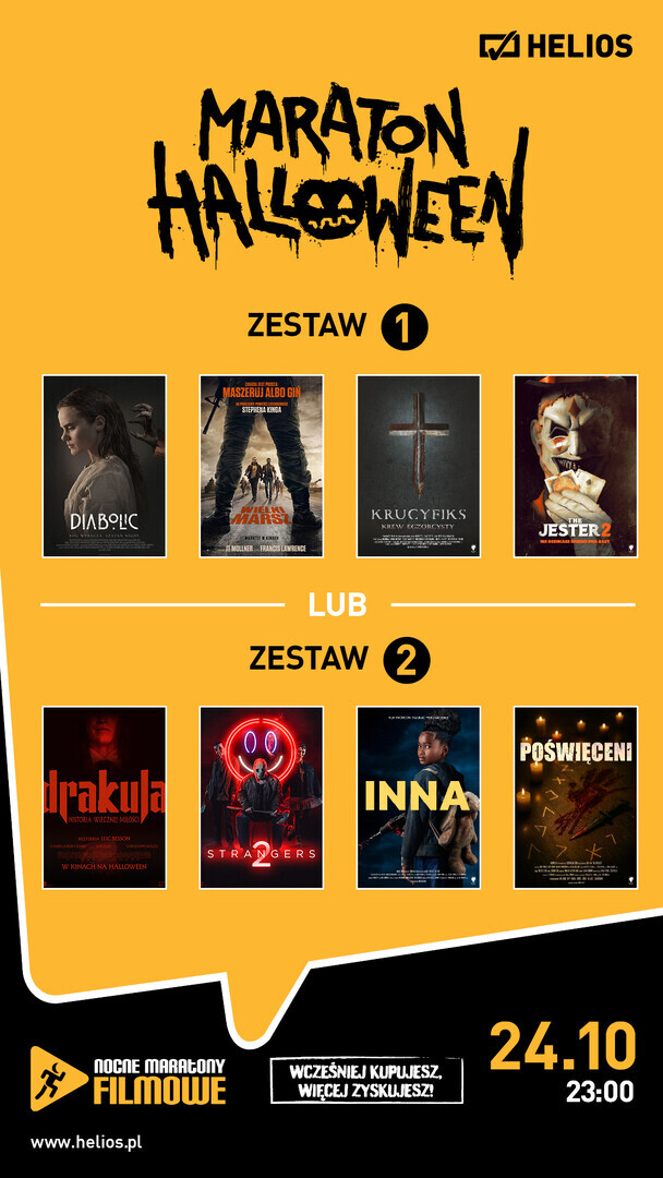 Premiery „DIABOLIC”, dalej „WIELKI MARSZ”, a potem jeszcze kolejno przedpremierowe „KRUCYFIKS” i na koniec „THE JESTER 2”. Start: 24.10.2024, godz. 23:00 Meta: około godz. 6:50.