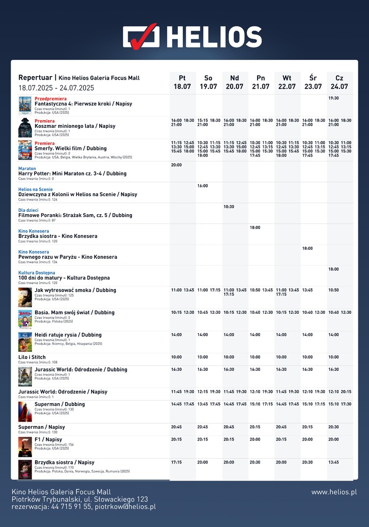 Czas na wielkie emocje w kinie Helios Piotrków Trybunalski! W tym tygodniu na widzów czekają przedpremierowe seanse wyczekiwanej produkcji Marvel Studios — Fantastyczna 4: Pierwsze kroki. W barwnej, retrofuturystycznej scenerii lat 60. Pierwsza Rodzina Marvela stanie do walki z kosmicznym zagrożeniem. Ale to dopiero początek! W repertuarze znajdziemy również przerażający powrót do klasyki horroru w sequelu Koszmaru minionego lata, animowaną przygodę dla najmłodszych w Smerfy. Wielki film oraz wiele innych propozycji – od kina familijnego, przez artystyczne, po wieczorne maratony z Harrym Potterem. Sprawdź, co jeszcze dzieje się na dużym ekranie!