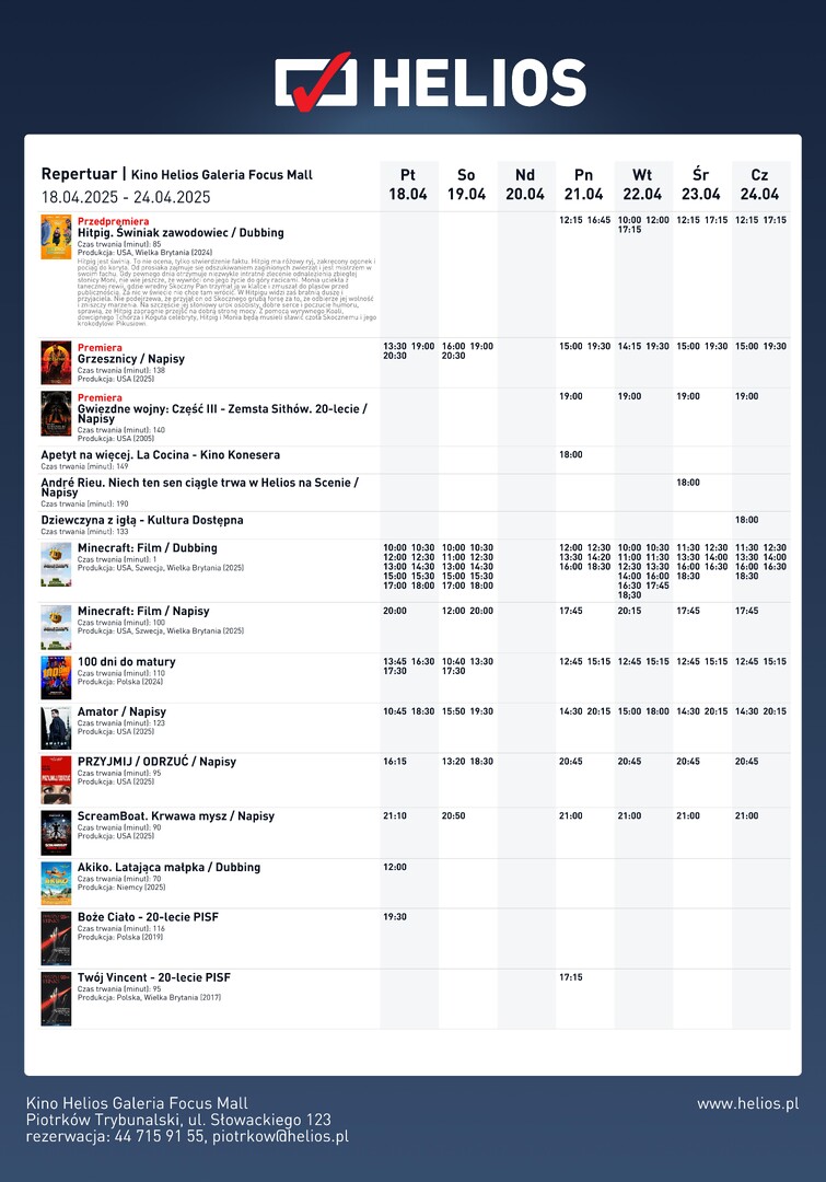 W kinie Helios Piotrków Trybunalski moc nowości filmowych. Przedpremierowo "Hitpig. Świniak zawodowiec". Hitpig jest świnią. To nie ocena, tylko stwierdzenie faktu. Hitpig ma różowy ryj, zakręcony ogonek i pociąg do koryta. Od prosiaka zajmuje się odszukiwaniem zaginionych zwierząt i jest mistrzem w swoim fachu. Premierowo: "Grzesznicy". Chcąc zostawić za sobą burzliwą przeszłość, bracia bliźniacy (Jordan) wracają do rodzinnego miasta, żeby zacząć życie od nowa. Na miejscu przekonują się, że czeka na nich jeszcze gorsze zło. „Jeśli tańczysz z diabłem, diabeł kiedyś przyjdzie za tobą do domu”. "Gwiezdne wojny: Część III - Zemsta Sithów. 20-lecie". W III części "Gwiezdnych wojen" Anakin Skywalker podejmie decyzję, która dramatycznie zaważy na losie nie tylko jego samego, ale i całej galaktyki. Zobaczcie też inne filmy w kinie Helios - Piotrków Trybunalski.