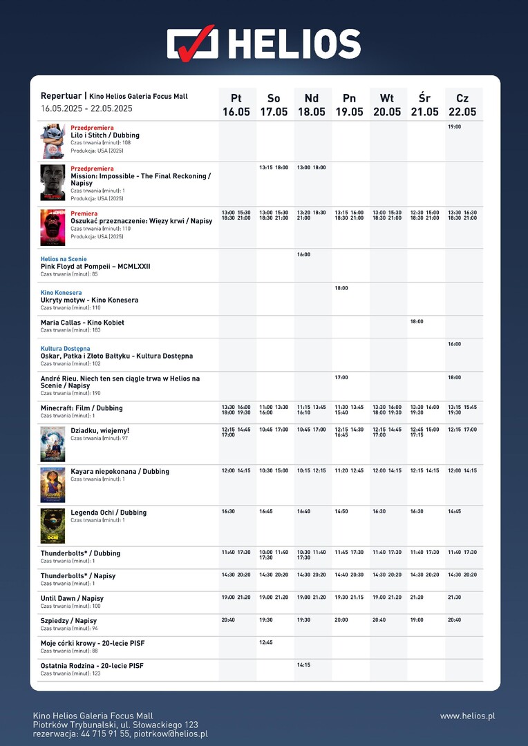W kinie Helios Piotrków Trybunalski gorące nowości filmowe! Przedpremierowo: "Lilo i Stitch". Nowa aktorska wersja klasycznego animowanego hitu Disneya z 2002 roku, „Lilo i Stitch”. "Mission: Impossible - The Final Reckoning". Film skupi się na Ethanie Huncie i jego zespole po zakończeniu z Mission: Impossible - Dead Reckoning, kiedy to bohaterowie mieli powstrzymać Entity przed przejęciem władzy nad planetą. Premierowo "Oszukać przeznaczenie: Więzy krwi", najnowsza odsłona krwawego i kasowego cyklu studia New Line Cinema, zabiera widzów do samych początków tego, jak śmierć zaczęła realizować swoje obłąkane poczucie sprawiedliwości. Helios na Scenie "Pink Floyd at Pompeii – MCMLXXII". Nakręcony w niesamowicie pięknych ruinach starożytnego rzymskiego amfiteatru w Pompejach we Włoszech, film przedstawia kameralny koncert Pink Floyd bez publiczności. Sfilmowany w październiku 1971. I to nie wszystkie nowości w kinie Helios - Piotrków Trybunalski.