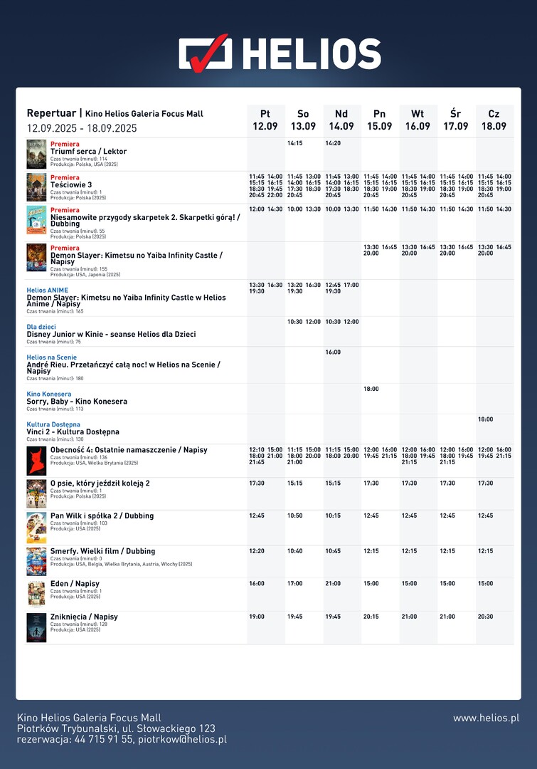 W kinie Helios same nowości filmowe! Premierowo: Triumf serca, Teściowie 3, Niesamowite przygody skarpetek 2. Skarpetki górą! oraz Demon Slayer: Kimetsu no Yaiba Infinity Castle. I to nie wszystkie gorące filmy w kinie Helios - Piotrków Trybunalski!