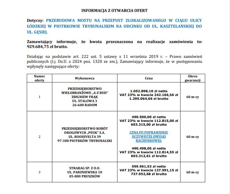 W przetargu wpłynęły trzy oferty, w tym jedna od piotrkowskiego przedsiębiorcy. Oferty złożyli Przedsiębiorstwo Wielobranżowe A-Z BUD z Radomia, Przedsiębiorstwo Robót Drogowych PEUK SA z Piotrkowa Trybunalskiego oraz STRABAG Sp. z o.o. z Pruszkowa. Najniższą kwotę zaproponowało piotrkowskie przedsiębiorstwo - czytamy na stornie UM.