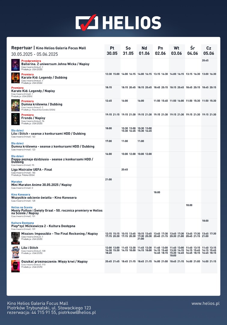W kinie Helios - Piotrków Trybunalski gorące nowości filmowe. Przedpremierowo "Ballerina. Z uniwersum Johna Wicka" - Osierocona przez porywacza, który zabił jej ojca i uprowadził młodszą siostrę, 7-letnia Eve trafia do rodziny zastępczej. Przepełniona gniewem i żądzą zemsty zwraca na siebie uwagę tajemniczej organizacji Ruska Roma, która przygarnia ją i doskonali w sztuce tańca i zabijania. Premierowo "Karate Kid: Legendy" - Po rodzinnej tragedii utalentowany zawodnik kurg fu Li Forg (Ben Warg) jest zmuszony do przeprowadzki z matką z Pekinu do Nowego Jorku. Li stara się zapomnieć o swojej przeszłości, próbując dopasować się do nowych okoliczności. "Dumna królewna. Dzielny król" - rozpieszczona królewna, banda chciwych drani, a także sprytny pies i przebiegła łasica, to bohaterowie tej ponadczasowej opowieści o odwadze, miłości i zaufaniu. Do każdego serca można znaleźć klucz. Dzielny król Mikołaj pragnie zdobyć serce dumnej i rozpieszczonej królewny Karoliny. I to nie wszystkie nowości w kinie Helios!