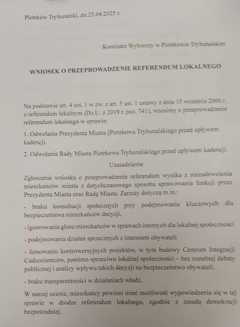 Beata Dróżdż, radna Sejmiku Województwa Łódzkiego z PiS zapowiedziała zbieranie grupy inicjatywnej oraz zbieranie podpisów pod referendum w sprawie odwołania prezydenta, oraz rady miasta Piotrkowa.