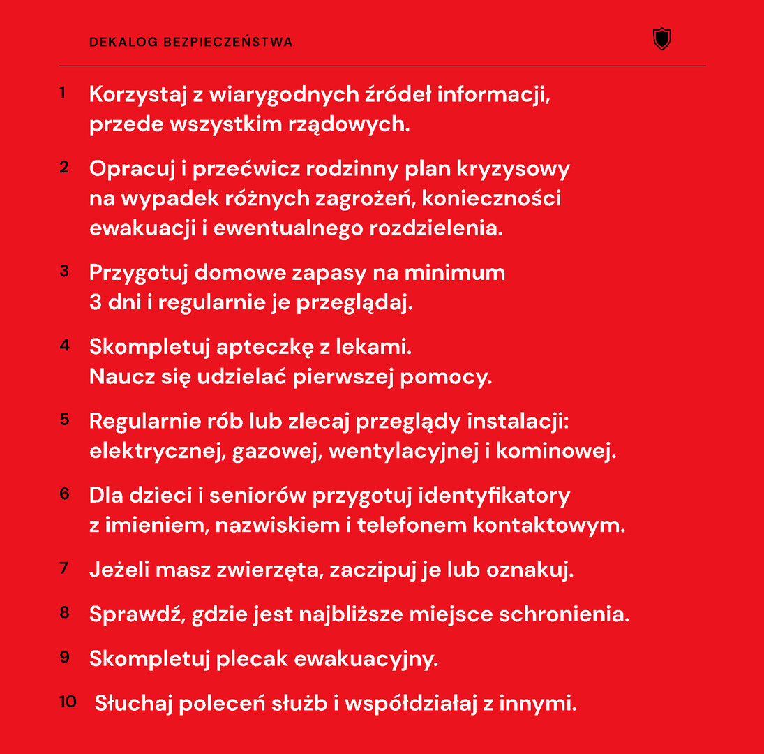 Istotnym elementem poradnika jest „Dekalog bezpieczeństwa” – dziesięć prostych, ale kluczowych zasad, które każdy obywatel powinien znać: