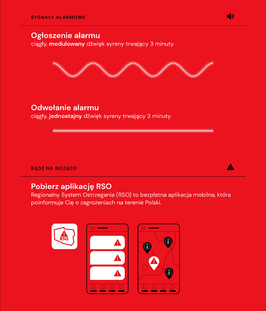 Aby czuć się bezpiecznie warto również znać sygnały alarmowe oraz śledzić komunikaty służb w radiu, telewizji oraz dzięki stworzonej do tego aplikacji: