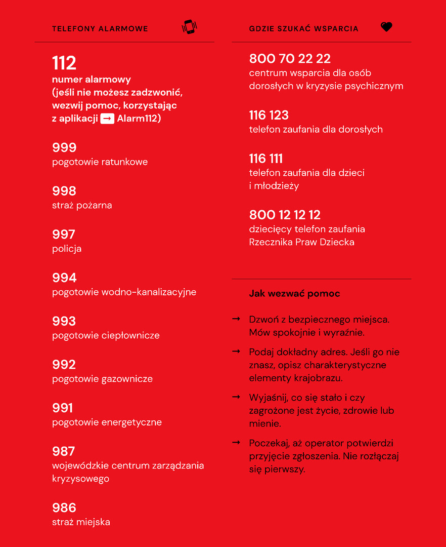 Poradnik zawiera także listę najważniejszych numerów telefonów potrzebnych w sytuacjach kryzysowych: