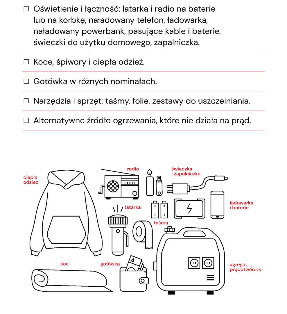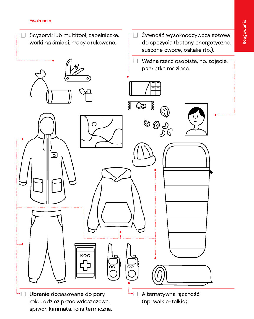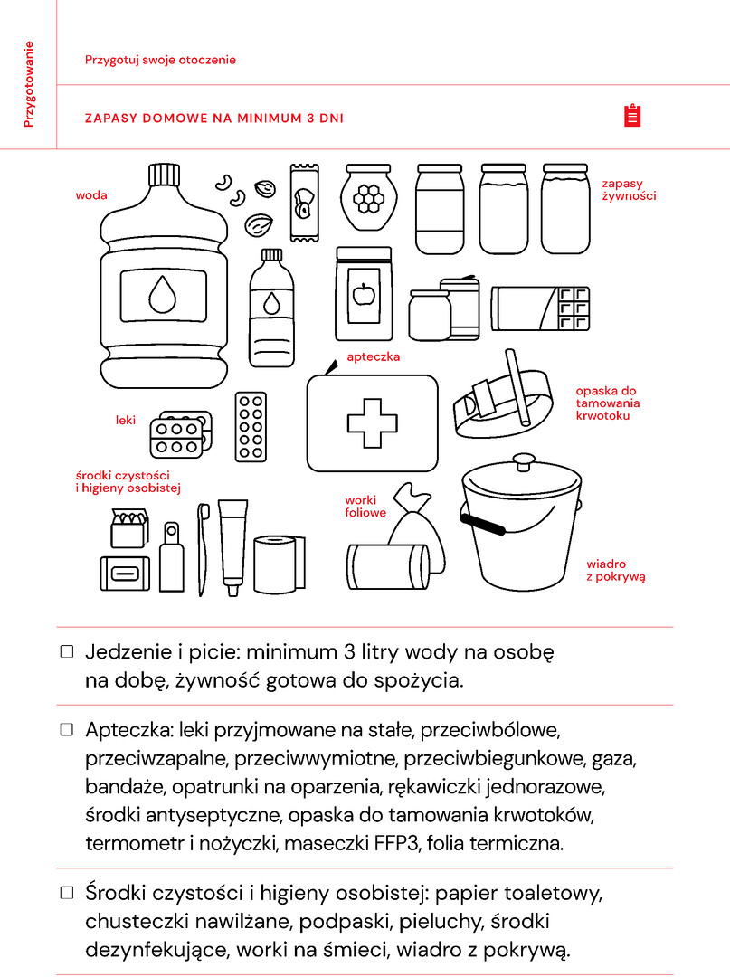 wskazówki, jak przygotować siebie, rodzinę i dom – w tym listę zapasów na minimum 3 dni,