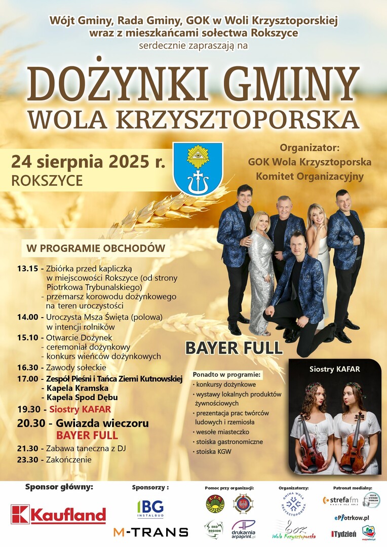 Wójt gminy, Rada Gminy, GOK w Woli Krzysztoporskiej wraz z mieszkańcami sołectwa Rokszyce serdecznie zapraszają na DOŻYNKI GMINY WOLA KRZYSZTOPORSKA, które odbędą się 24 sierpnia 2025 r. w Rokszycach.