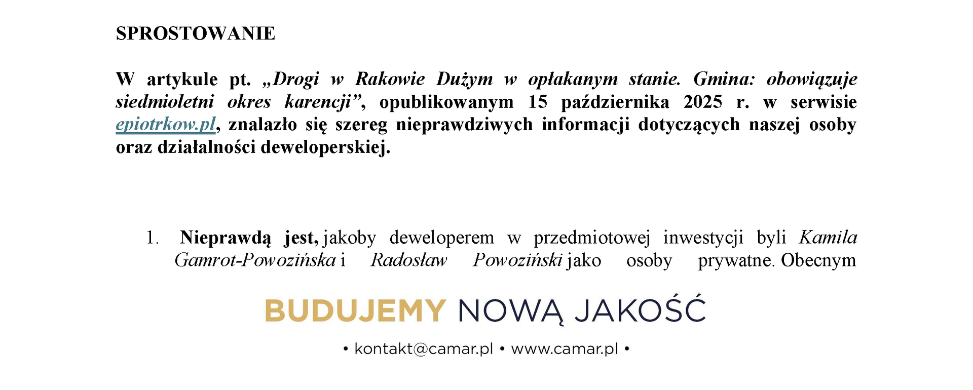 Redakcja otrzymała sprostowanie od jednej ze stron w związku z naszym wcześniejszym materiałem dotyczącym stanu dróg na osiedlu w Rakowie Dużym. Odnosi się ono do informacji zawartych w artykule pt. Toną w błocie – mieszkańcy Rakowa Dużego proszą o pomoc w sprawie dróg na osiedlu, który ukazał się na naszym portalu w dniu 15 października 2025 roku. Zgodnie z obowiązującymi przepisami prawa prasowego publikujemy jego treść odnoszącą się do faktów.