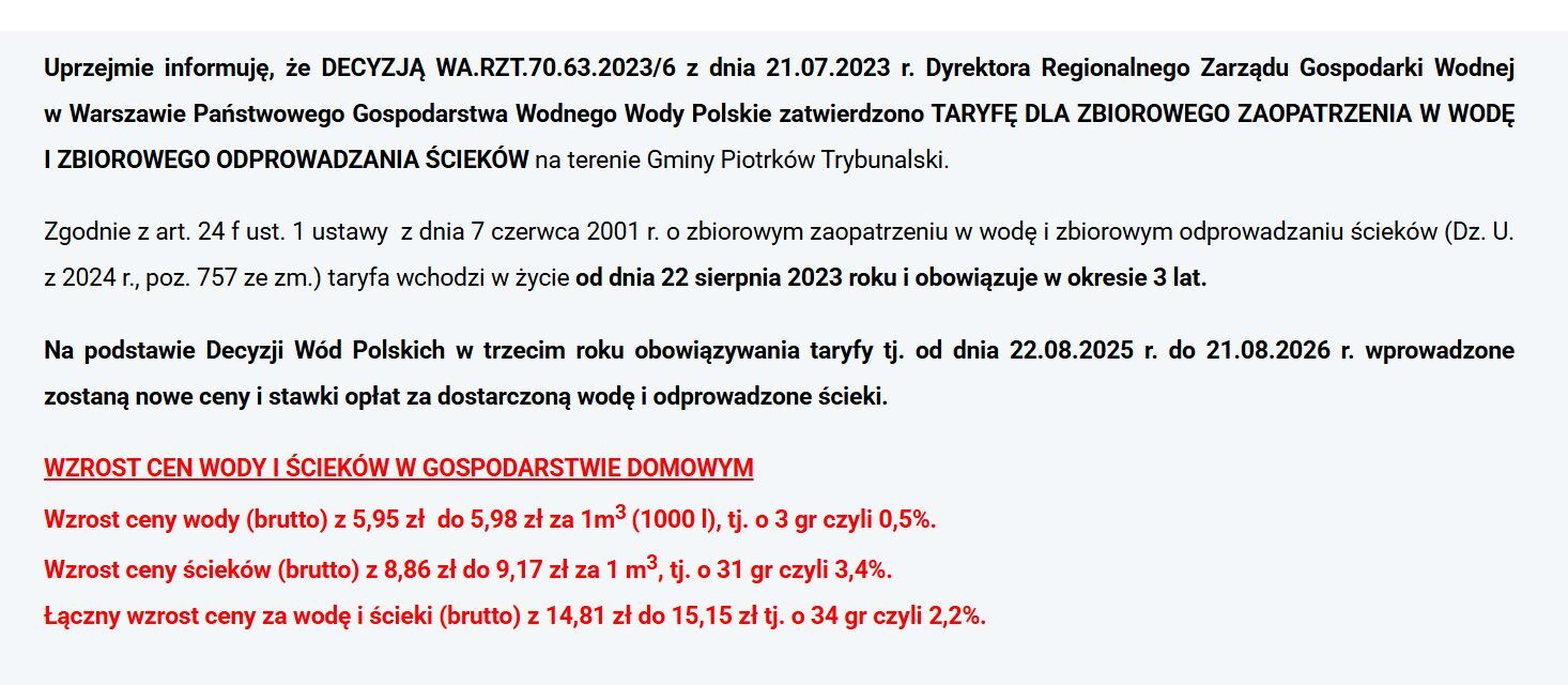 Państwowa spółka Wody Polskie zatwierdziła taryfę dla zbiorowego zaopatrzenia w wodę i odprowadzania ścieków w Piotrkowie. Nowe stawki będą obowiązywać od 22 sierpnia 2025 roku do 21 sierpnia 2026.