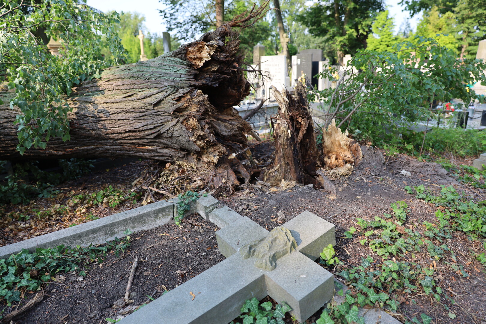 Na cmentarzach w Piotrkowie Trybunalskim powalone gałęzie i drzewo znów dały o sobie znać. Po niedzielnym załamaniu pogody ucierpiało kilkanaście nagrobków na nowym i starym cmentarzu. Wielka lipa powaliła się, niszcząc kilka nagrobków w tym zabytkowych i odnowionych dzięki staraniom kwesty Towarzystwa Przyjaciół Piotrkowa Trybunalskiego, na starym cmentarzu. Na nowym cmentarzu konar również uszkodził groby piotrkowian.