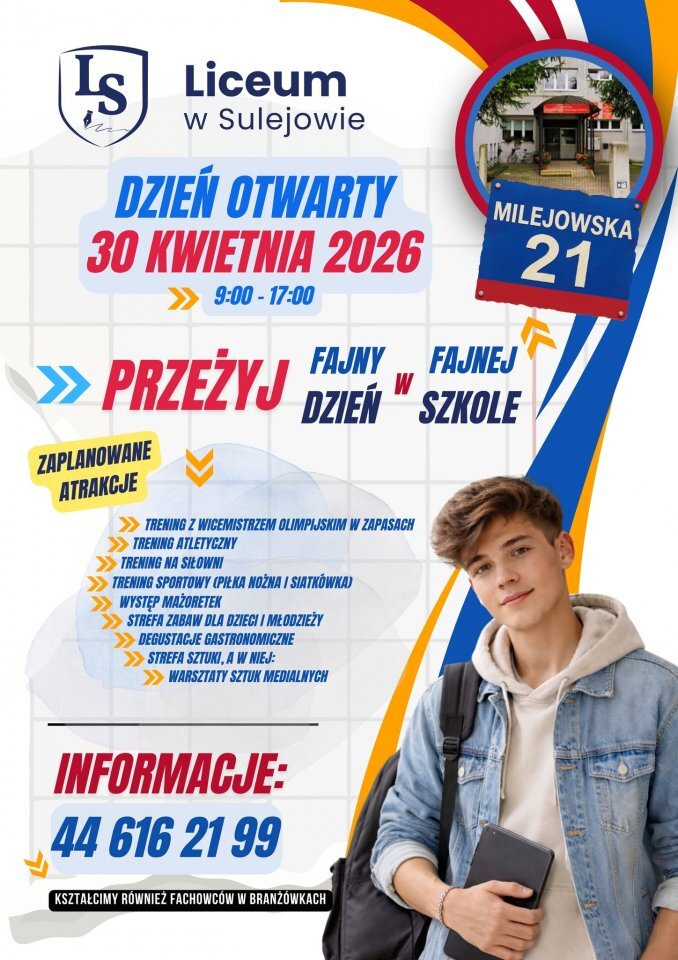 Już 30 kwietnia 2026 roku w liceum w Sulejowie odbędzie się Dzień Otwarty, skierowany do uczniów kończących szkołę podstawową oraz ich rodziców. W godzinach od 9:00 do 17:00 będzie można poznać ofertę edukacyjną placówki, zwiedzić szkołę oraz wziąć udział w licznych atrakcjach przygotowanych przez nauczycieli i uczniów.
