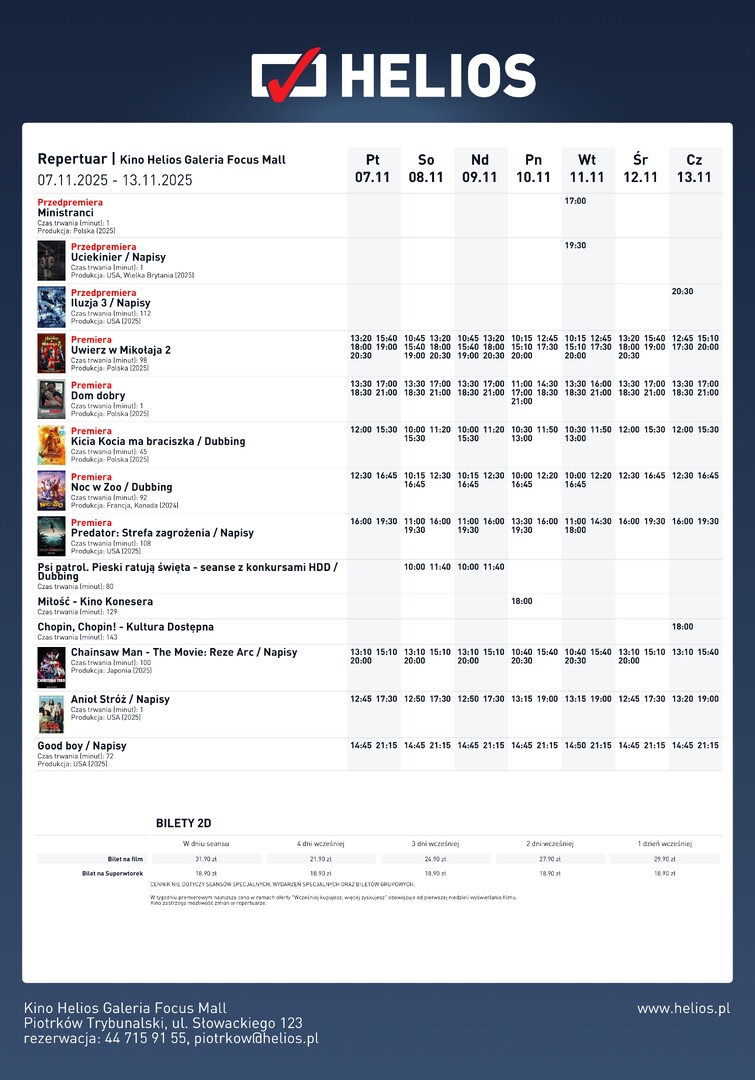 Listopad w Kinie Helios w Piotrkowie Trybunalskim zapowiada się wyjątkowo gorąco! Na ekranach pojawią się przedpremierowe hity: młodzieńczy bunt w filmie „Ministranci”, widowiskowa ekranizacja Stephena Kinga „Uciekinier” oraz pełna iluzji i akcji kontynuacja „Iluzja 3”. W premierach nie zabraknie emocji rodzinnych, świątecznego klimatu i mocnych wrażeń – od wzruszającego „Uwierz w Mikołaja 2”, przez poruszający dramat „Dom dobry”, po animowane przygody Kici Koci i bohaterskie zwierzaki z filmu „Noc w Zoo”. A dla miłośników klasyki i sztuki filmowej – wyjątkowe seanse w cyklach Kino Konesera i Kultura Dostępna.