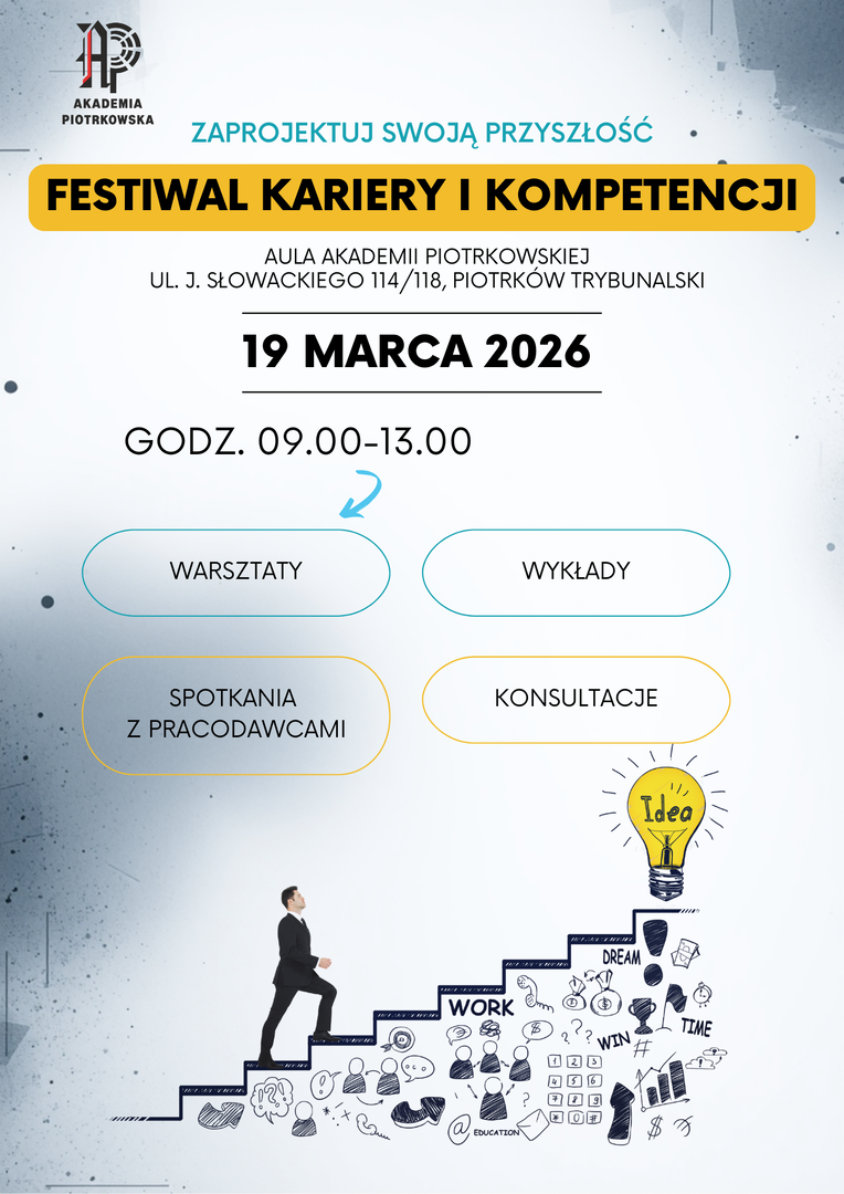 Festiwal Kariery i Kompetencji odbędzie się 19 marca w Akademii Piotrkowskiej. Wydarzenie ma charakter edukacyjny i zawodowy i jest skierowane do studentów Akademii Piotrkowskiej, uczniów szkół średnich oraz mieszkańców z regionu.