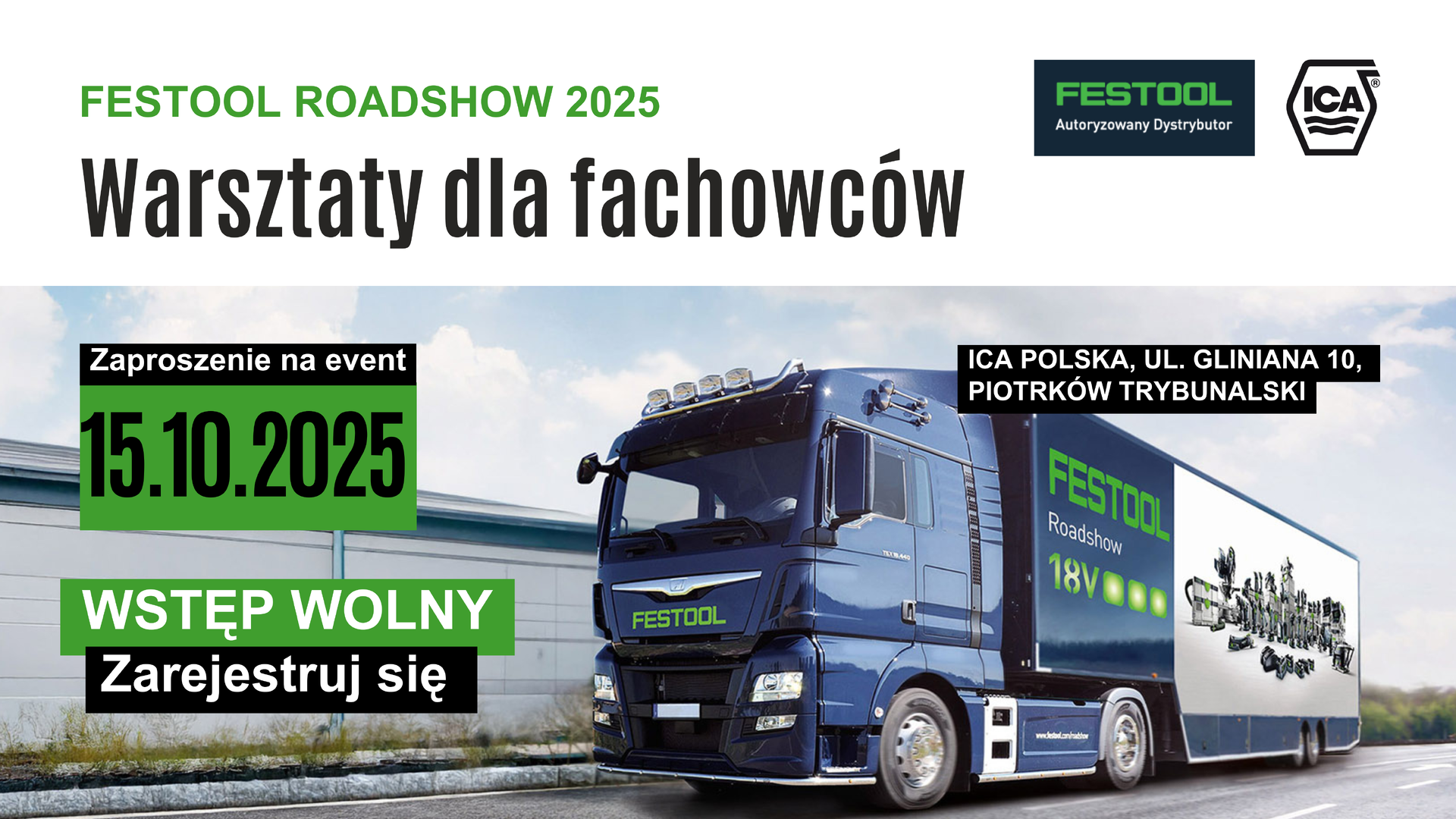 Już 15 października w siedzibie ICA Polska przy ul. Glinianej 10 odbędzie się wydarzenie, które na jeden dzień zamieni Piotrków Trybunalski w centrum innowacji dla branży budowlanej i stolarskiej. Festool Roadshow 2025 to nie tylko pokazy na żywo i premiery najnowszych narzędzi – to praktyczne warsztaty, bezpośredni kontakt z ekspertami i wyjątkowe promocje, dostępne tylko dla uczestników. Jeśli jesteś stolarzem, cieślą, monterem suchej zabudowy, wykonawcą tarasów czy specjalistą od wykończeniówki – tego dnia nie może Cię zabraknąć.