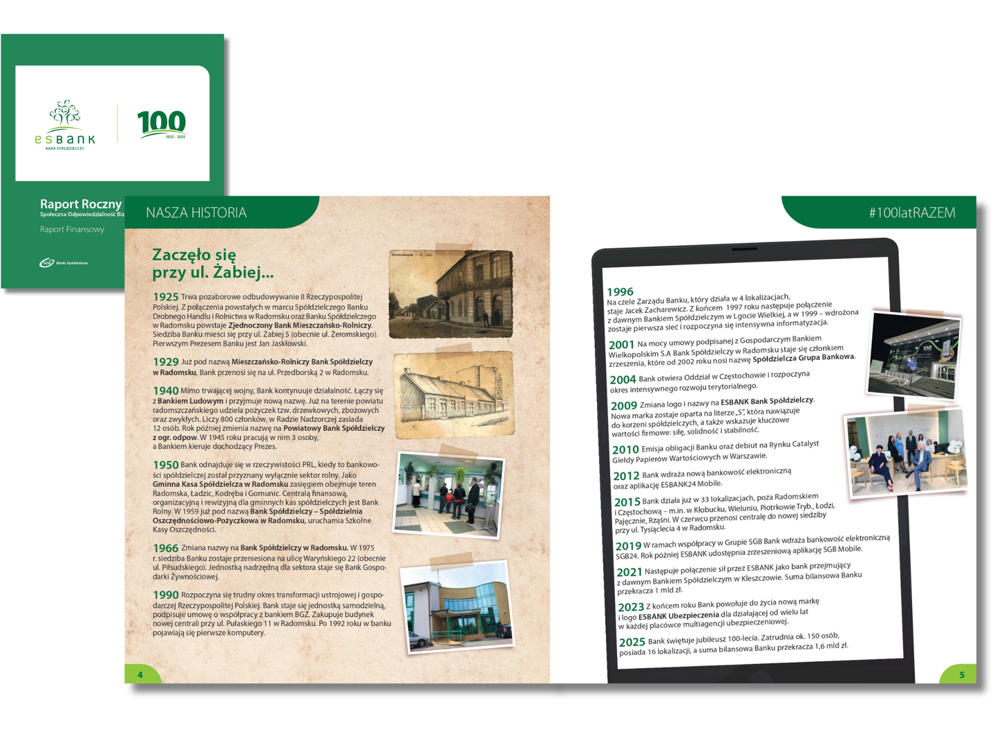 Więcej na temat 100 lat tradycji, misji oraz konsekwentnej drogi od lokalnego, Mieszczańsko-Rolniczego Banku Spółdzielczego, który powstał w 1925 roku w Radomsku, do uniwersalnej instytucji finansowej dla każdego, która specjalizuje się w finansowaniu firm z sektora MŚP, posiada stabilną pozycję na lokalnym rynku oraz należy do grona liderów w Grupie SGB – w jubileuszowym Raporcie Rocznym ESBANKU.