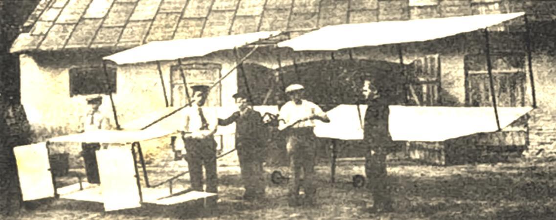 Pierwszy lot na terenie wyścigów konnych (obecnie teren lotniska Aeroklubu Ziemi Piotrkowskiej) miał miejsce w czerwcu 1913 roku. Szybowiec zbudowany przez uczniów czwartej klasy piotrkowskiego gimnazjum na podstawie opisu zamieszczonego w broszurze inż. M. Króla "Jak zbudować szybowiec i wykonywać na nim wzloty" pilotował jeden z młodych konstruktorów - Jan Strahler. Próby wymagały zgody władz carskich i były nadzorowane przez dwóch policjantów. Dotychczasowe doświadczenia "lotnicze" gimnazjalistów ograniczały się do załogowych lotów latawcowych (skład załogi stanowił zwykle jeden kot z "sąsiedztwa"). Szybowiec był holowany przez sześciu kozaków na koniach. Budowa szybowca pochłonęła ponad dwa lata, bambus będący podstawą konstrukcji ściągnięto aż z Japonii.