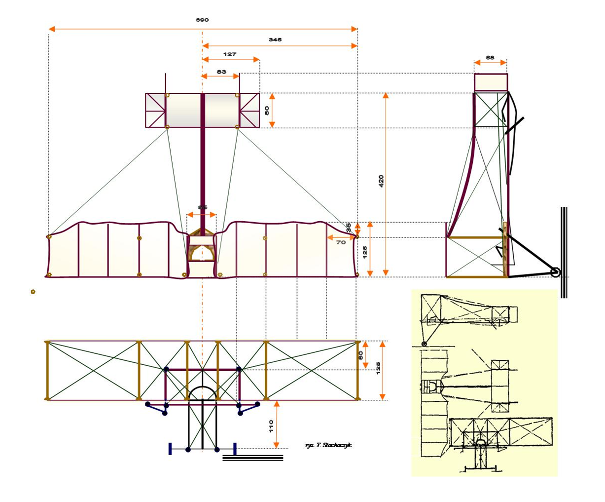 Konstrukcje szybowcowe z tego okresu zazwyczaj nie miały sterów, szybowiec był sterowany poprzez zmianę położenia środka ciężkości, co uzyskiwano dzięki odpowiedniemu wychyleniu ciała pilota (podwieszonemu zwykle na lince). Zamiast podwozia głównego używano głównie nóg pilota. Piotrkowski szybowiec różnił się od swojego pierwowzoru.Przede wszystkim był większy, przez co uzyskano teoretycznie jego większy udźwig. Ponadto uczniowie zastosowali proste podwozie z kółkami i wyposażyli go w stery kierunku oraz wysokości. Wg opisu inż. Króla zbudowano na polskich terenach łącznie trzy konstrukcje: szybowiec uczniów gimnazjum im. Chrzanowskiego w Warszawie (1912), szybowiec Babińskiego - również w Warszawie (1913) i opisywany szybowiec uczniów gimnazjum z Piotrkowa Trybunalskiego (1913).