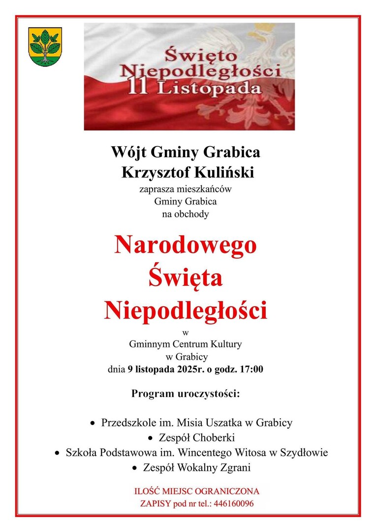 Wójt Gminy Grabica, Krzysztof Kuliński, zaprasza wszystkich mieszkańców na uroczyste obchody Narodowego Święta Niepodległości, które odbędą się 9 listopada 2025 roku o godzinie 17:00 w Gminnym Centrum Kultury w Grabicy.