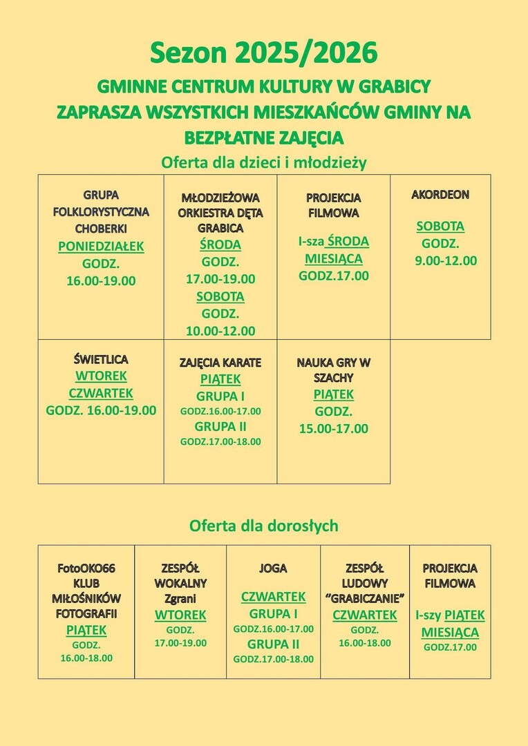 Wszystkie zajęcia są bezpłatne i dostępne dla mieszkańców Gminy Grabica.