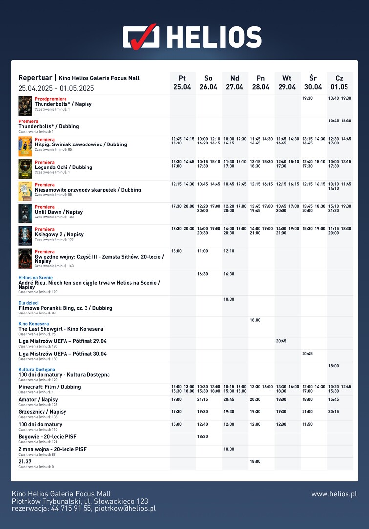 Moc nowości w kinie Helios - Piotrków Trybunalski. Przedpremierowo najnowszy film ze Studia Marvel "Thunderbolts*" przedstawia nietypową drużynę antybohaterów — Yelenę Belovą, Bucky’ego Barnesa, Czerwonego Strażnika, Ghosta, Taskmastera i Johna Walkera. Premierowo: "Hitpig. Świniak zawodowiec". Hitpig jest świnią. To nie ocena, tylko stwierdzenie faktu. Hitpig ma różowy ryj, zakręcony ogonek i pociąg do koryta. Od prosiaka zajmuje się odszukiwaniem zaginionych zwierząt i jest mistrzem w swoim fachu. Gdy pewnego dnia otrzymuje niezwykle intratne zlecenie odnalezienia zbiegłej słonicy Moni, nie wie jeszcze, że wywróci ono jego życie do góry racicami. "Legenda Ochi". W odległej wiosce na wyspie Karpatia mieszka młoda, skryta dziewczyna o imieniu Yuri. W jej okolicy panuje przekonanie, że w leżących nieopodal lasach kryją się niebezpieczne mityczne stworzenia znane jako Ochi. W obawie przed nimi, mieszkańców przestrzega się przed wychodzeniem z domu po zmroku. "Niesamowite przygody skarpetek". Czy kiedykolwiek zastanawialiście się, co się dzieje z tymi wszystkimi zaginionymi skarpetkami? Każdy z nas miał to doświadczenie – wrzucamy parę skarpetek do szuflady, szafy czy też do kosza na pranie i później wyjmujemy… tylko jedną skarpetkę! Gdzie one znikają? "Until Dawn". Rok po tajemniczym zniknięciu swojej siostry Melanie, Clover i jej przyjaciele udają się do odległej doliny, w której zniknęła, w poszukiwaniu odpowiedzi. Przeszukując opuszczone centrum dla zwiedzających, odkrywają, że są prześladowani przez zamaskowanego zabójcę i mordowani jeden po drugim... tylko po to, aby obudzić się i znaleźć się z powrotem na początku tego samego wieczoru. I to nie wszystkie nowości w kinie Helios!