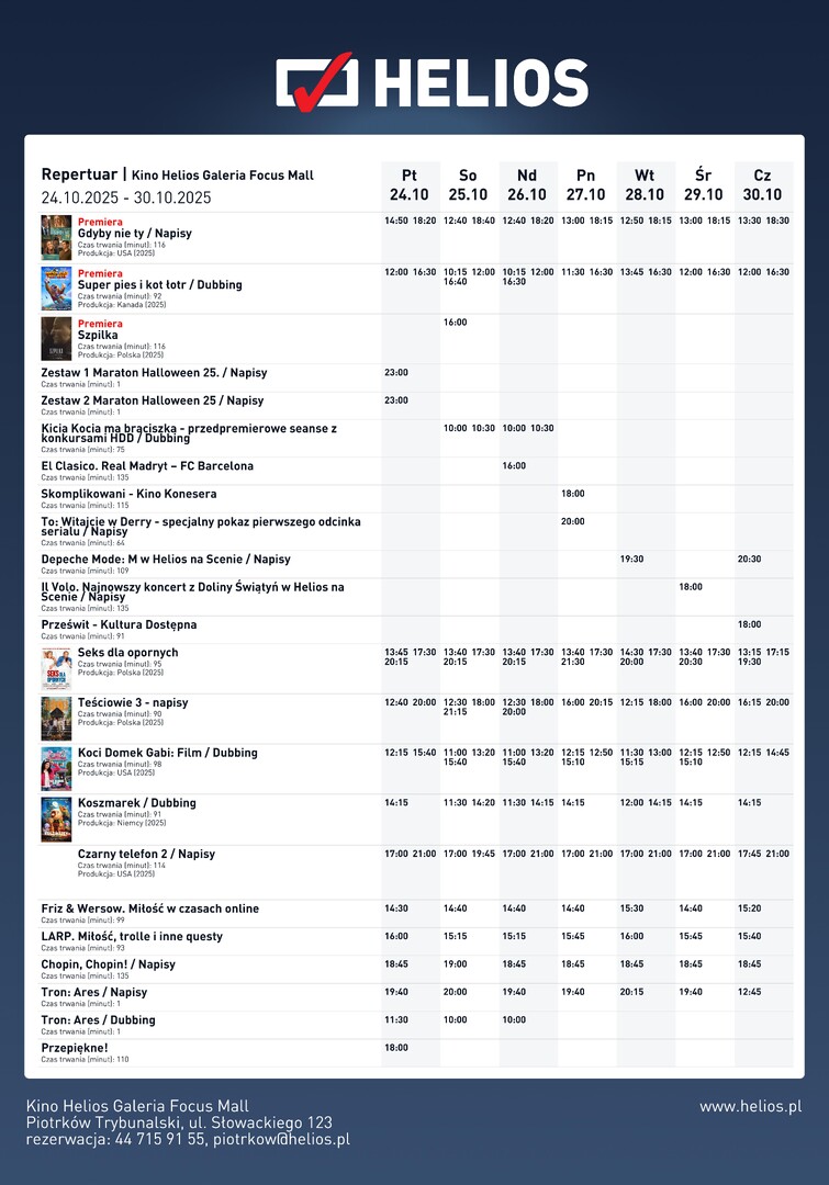 Jesień w Heliosie w Piotrkowie Trybunalskim zapowiada się pełna wrażeń! Wśród premier zobaczymy poruszający dramat „Gdyby nie ty” z Allison Williams i Mckenną Grace, pełną humoru animację „Super pies i kot łotr” z dubbingiem Pawła Domagały i Jarosława Boberka oraz dokument „Szpilka”, ukazujący kulisy kariery znanego boksera. Na widzów czekają także maratony horrorów z okazji Halloween, koncerty Il Volo i Depeche Mode, a także seanse z cykli Kino Konesera, Kultura Dostępna i Helios na Scenie. Nie zabraknie też sportowych emocji – El Clasico: Real Madryt – FC Barcelona zobaczymy na żywo na wielkim ekranie! Październik w Heliosie to miesiąc pełen emocji!