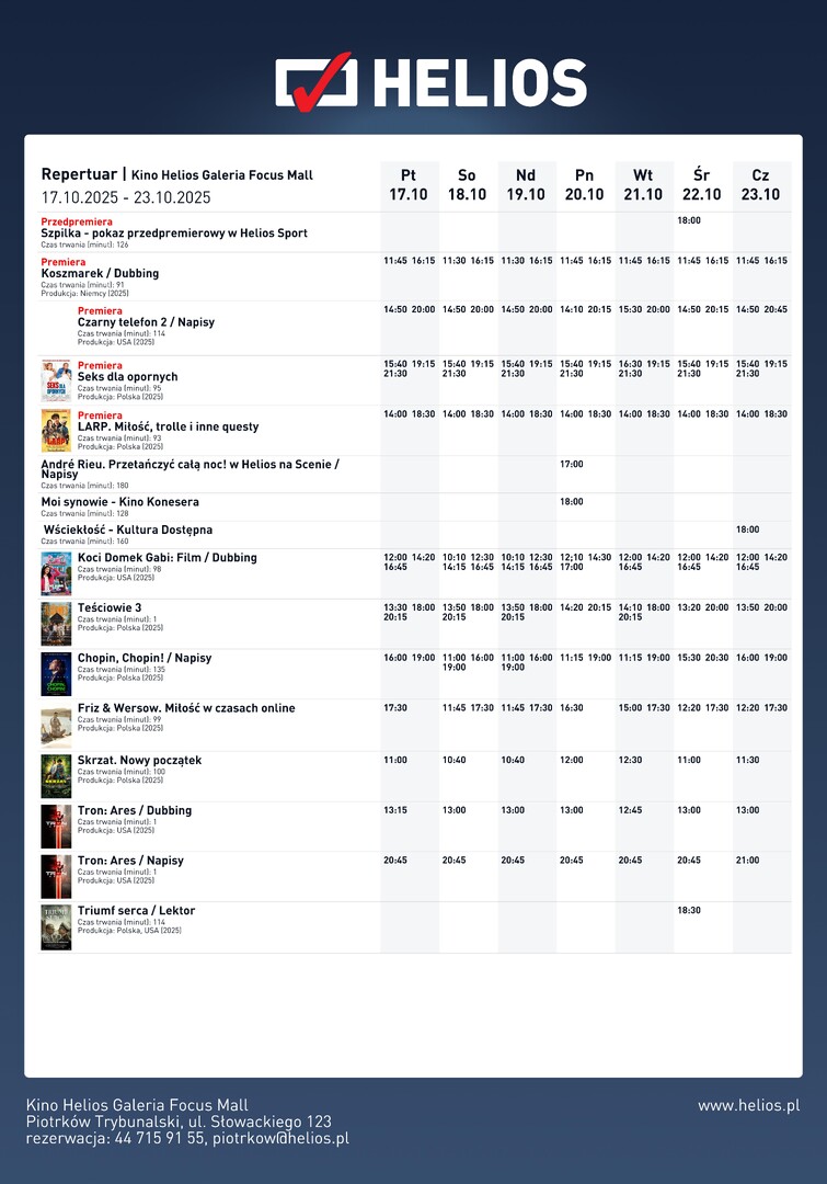 Emocje, adrenalina i odrobina romantyzmu na wielkim ekranie – kina Helios w Piotrkowie Trybunalskim. Wśród premier i specjalnych pokazów znajdzie się przedpremierowy pokaz dokumentu „Szpilka” – poruszającej historii jednego z najbardziej charyzmatycznych polskich bokserów. Na ekranach pojawią się też nowości dla widzów w każdym wieku: animowana opowieść o przyjaźni „Koszmarek”, mrożący krew w żyłach thriller „Czarny telefon 2”, komedia o miłości i rutynie „Seks dla opornych” oraz pełna humoru młodzieżowa produkcja „LARP. Miłość, trolle i inne questy”. W repertuarze nie zabraknie również propozycji dla miłośników muzyki, ambitnego kina i mocnych emocji – na scenie André Rieu, w cyklu Kino Konesera dramat „Moi synowie”, a w ramach Kultury Dostępnej film „Wściekłość”.