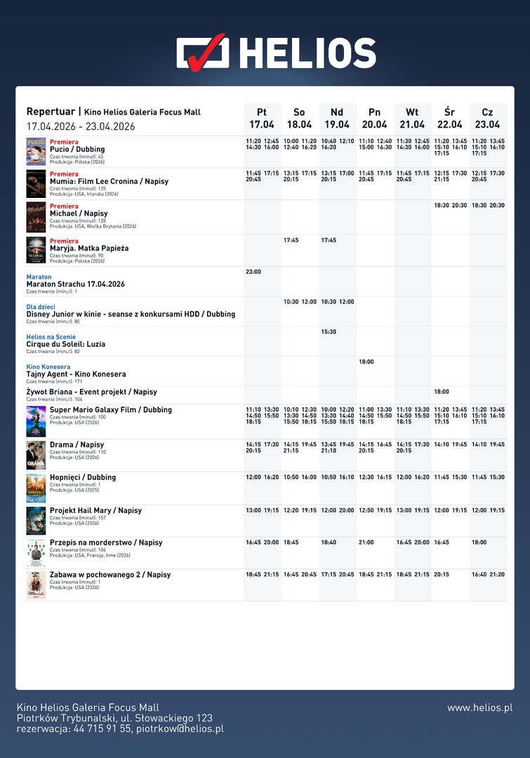 Nowy repertuar Kino Helios w Piotrkowie Trybunalskim to szerokie spektrum emocji – od familijnych przygód „Pucia”, przez mroczną „Mumię” Lee Cronina, po muzyczną biografię Michaela Jacksona i duchową opowieść o Janie Pawle II. Do tego nocny maraton horrorów, propozycje dla najmłodszych i ambitne kino w ramach Konesera.