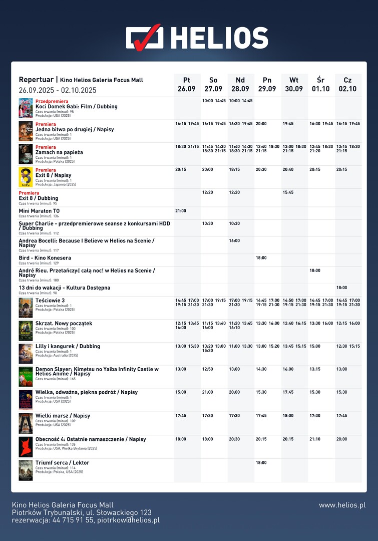Kino Helios w Piotrkowie Trybunalskim zaprasza na niezwykły tydzień filmowych premier i przedpremier! Na widzów czekają wzruszające animacje dla najmłodszych, pełne napięcia thrillery, opowieści o intrygach i wielkich wydarzeniach historycznych, a także wyjątkowe maratony i retransmisje koncertów. Sprawdź, co nowego pojawi się na ekranach – i przeżyj niezapomniane chwile w kinie!