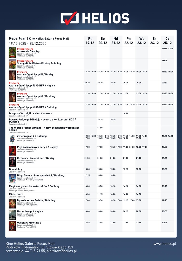 Kina Helios zapraszają widzów na nowy, świąteczny repertuar pełen premier i filmowych hitów dla różnych grup odbiorców. Na ekranach pojawi się m.in. widowiskowy „Avatar: Ogień i popiół”, familijna animacja „Magiczna gwiazdka zwierzaków” oraz polski dramat „Dom dobry”. W ofercie nie zabraknie także propozycji dla miłośników mocniejszych emocji, takich jak świąteczny horror „Cicha noc, śmierci noc”.