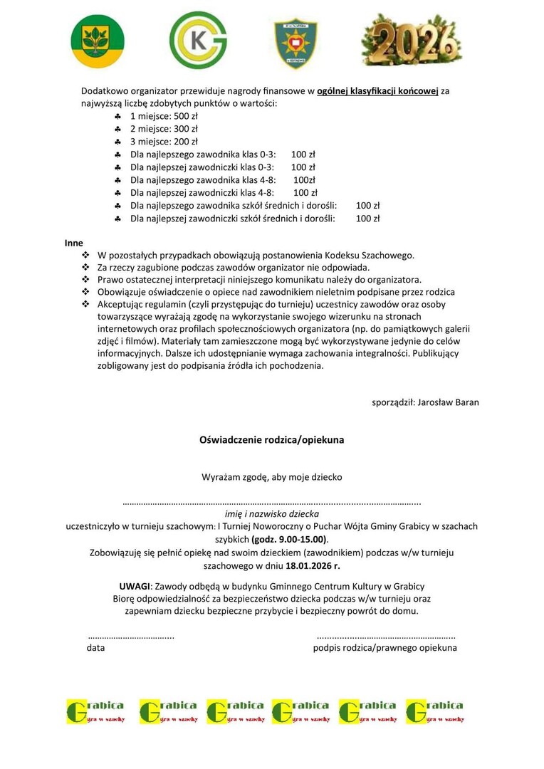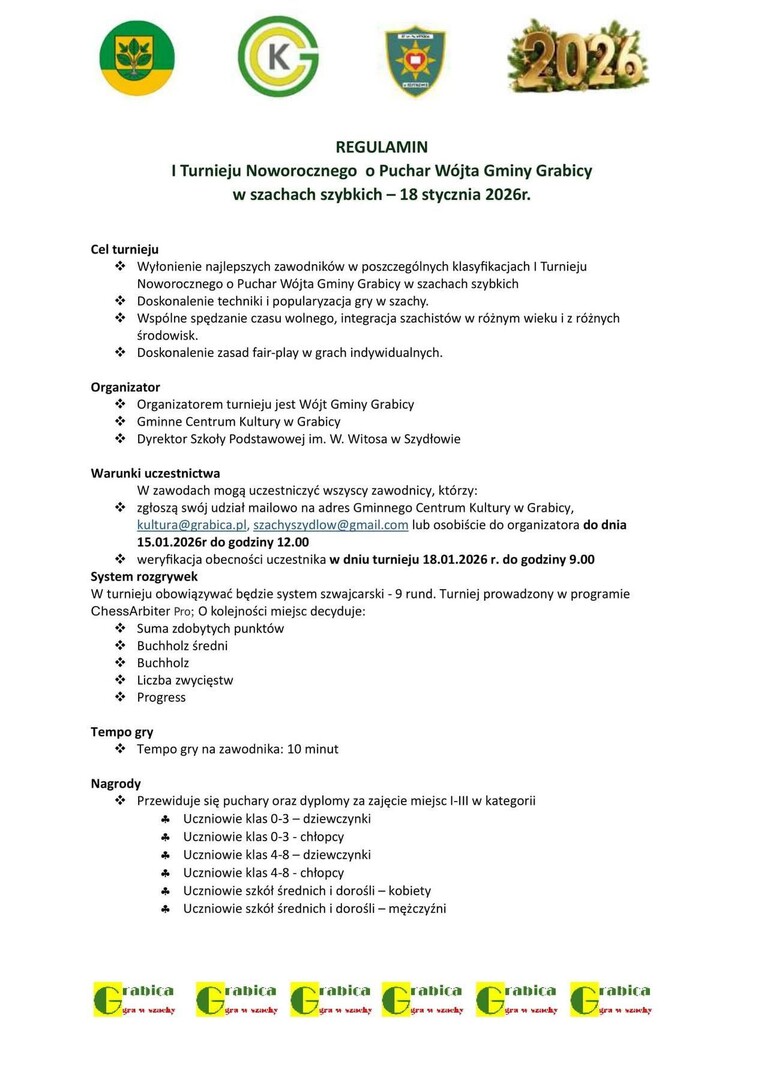 Wójt Gminy Grabica serdecznie zaprasza wszystkich miłośników królewskiej gry do udziału w I Noworocznym Turnieju Szachowym w szachach szybkich.